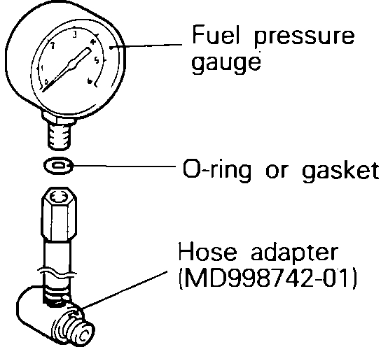 3. Using the fuel pressure gauge adapter (MD998742-01) or equivalent, install the fuel-pressure gauge to the delivery pipe (fuel rail).