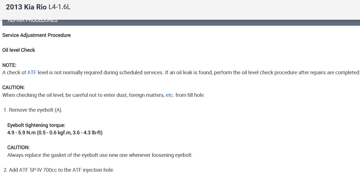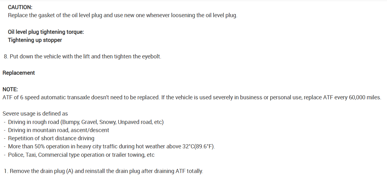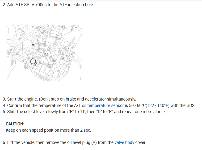 Type .................... MICHANG ATF SP-IV, SK ATF SP-IV, NOCA ATF SP-IV, KIA Genuine ATF SP-IV or other brands meeting specifications approved by KIA MOTOR CORP.