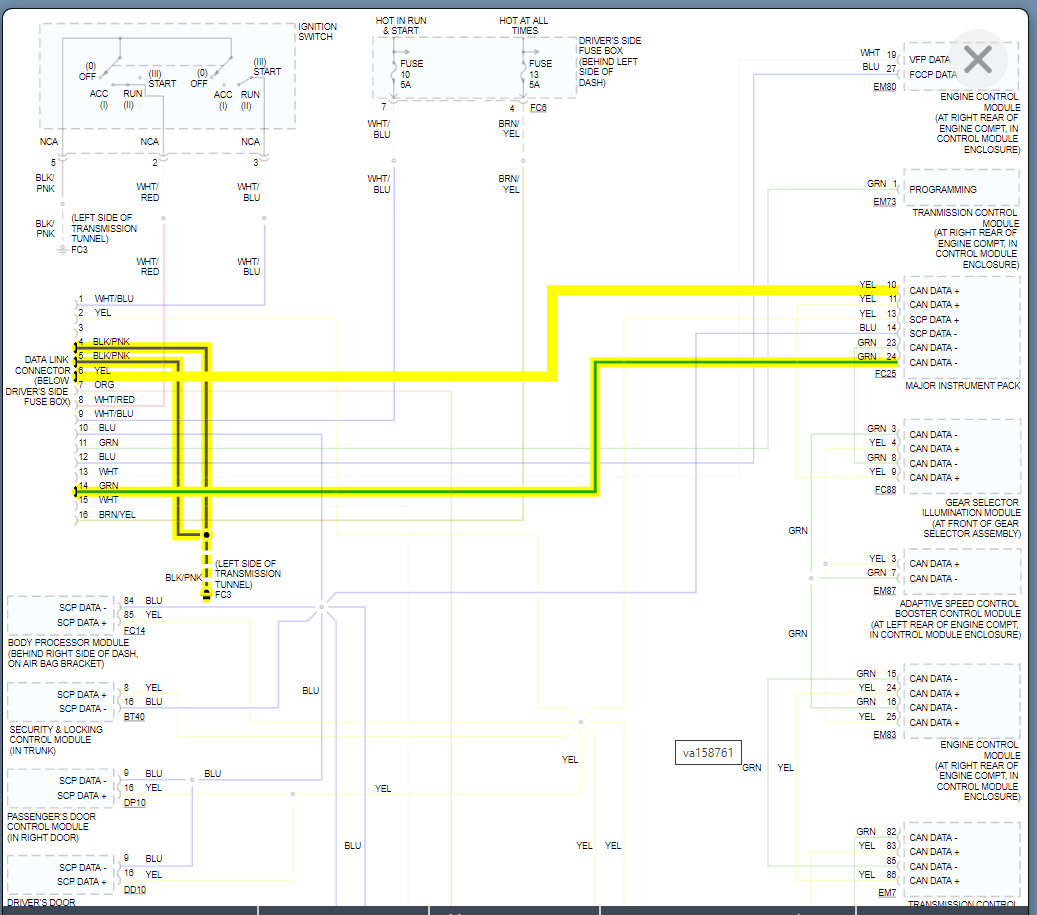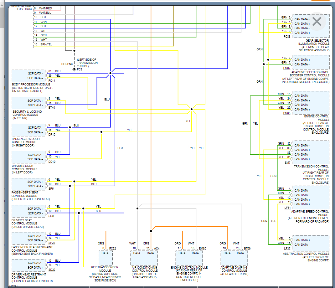 This CAN network is what we call daisy chain network. That means starting at the DLC the wires run to the cluster. Then from there they go to the gear selector, then the adaptive speed control and so on down the line.