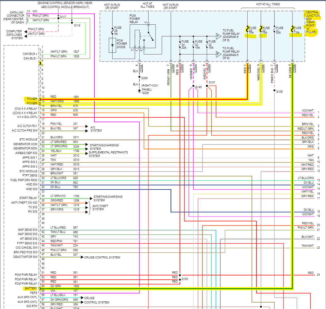 Here are the fuses that are permanent battery feeds that retain the memory, Fuse 29 15amp, Fuse 20 15amp, and Fuse 5 7.5amp. They are kind of difficult to see on the wiring diagram. The 6th diagram shows the PCM Grounds, if there are any broken grounding straps or corroded grounds to the frame or body, or any voltage drop from the engine block to battery negative, or the frame to the battery, this can have the same effect as a bad PCM ground. So, check those fuses for power on both sides, here are some guides to help.