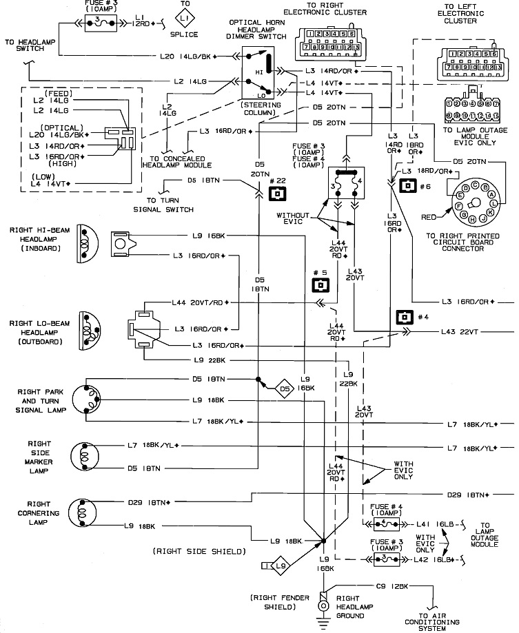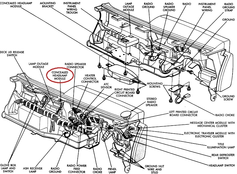 There's a control module under the dash. I worked on a similar problem on a Daytona. In that one, there were a lot of relays built into the module. Relays are noted for developing bad solder connections on their terminals. Those are real easy to repair if you can get to them. To check for this, feel the module to see if you can detect a light click when you turn the head lights on and off. If you can feel or hear that, check the voltages on the brown / yellow and the dark blue / yellow wires at the connector. You should find the same voltage on both wires, either 0 volts or 12 volts, when the doors are not moving. When you change the head light switch's position, one of those wires should change so there is 0 volts on one and 12 volts on the other. If you find the voltage never changes on one of those wires, or they both change at the same time and are at the same voltage, suspect a bad solder connection on one or both relays. If you find they switch to different voltages momentarily, but the head light doors don't move, the better suspect would be a broken wire between the module and the door motor. If it looks like that is the case, there's another test we can do to find that.