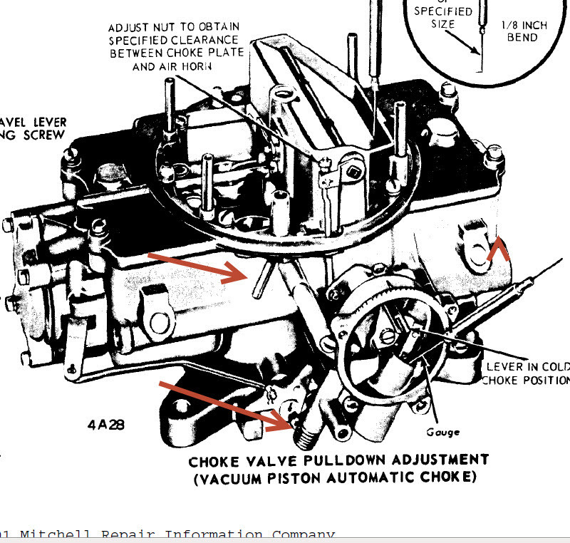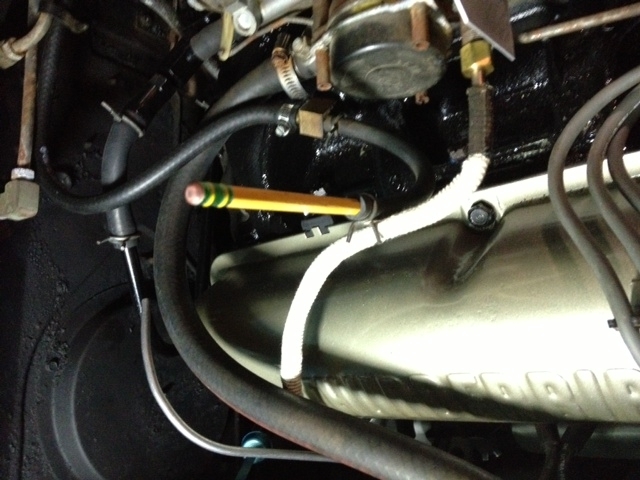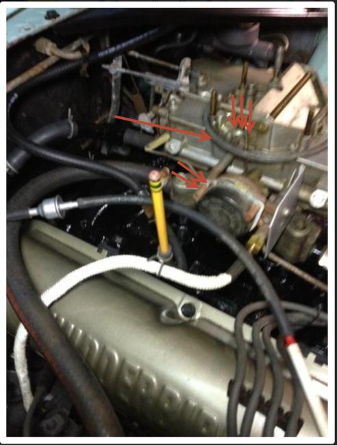 Thanks for your help! I wasn't able to open or enlarge your picture, sorry. I will take some pictures in the next day or two and send them your way. I do remember a rusty clip that held the two metal lines together. The 1st. line went to the choke assembly. But, the 2nd line I can't remember....since it is in the exhaust, it didn't seem right to connect the hose that went to the heater area. I was thinking that hose should be connected to a vacuum source some place. That line with the check valve I think was tied to the fender brace and went to the back area of the engine. Will take a closer look at the base of the carb for a vacuum port.....it didn't make any sense to hook it up to the 2nd. exhaust tube. Hope I'm on the right track....I bought the car new, had much better memory back in those days. @ 74 years of age, I'm lucky anything still works!