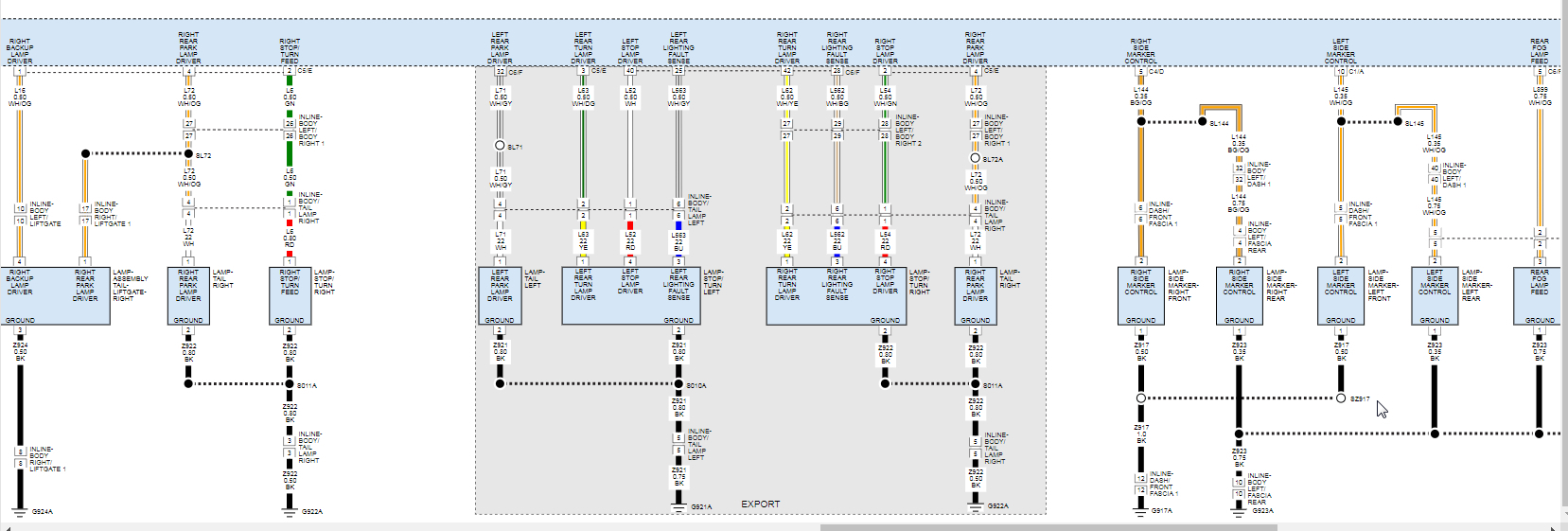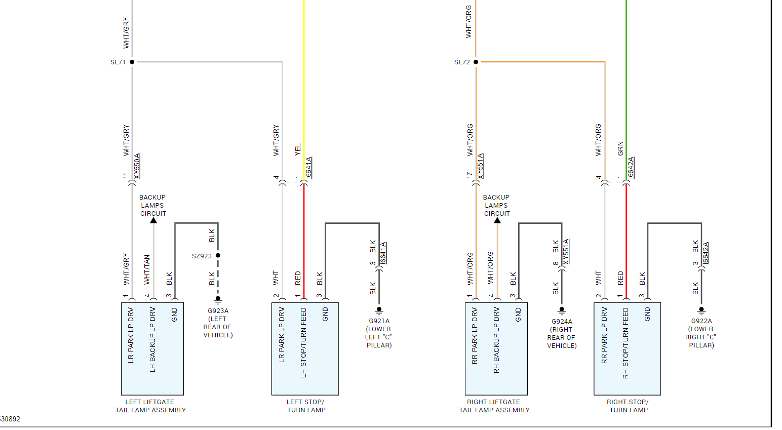 My right under door carriage was hit. Since then, my right rear turn, backup, park and brake lights are not working. I found the attached wiring diagram on this site and I believe the problem might be at the Inline-body/Tail Lamp Right connector or at ground stud G922A. Would it be possible to provide me the location of those 2 components.
