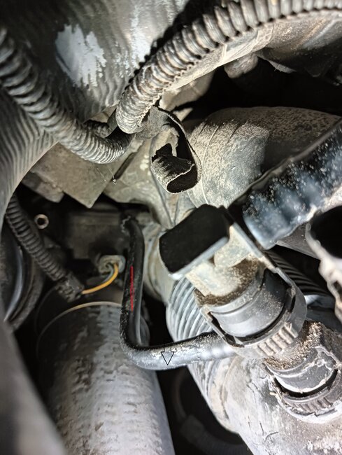 I still have lean issues and I noticed this pipe (Marked red) is loose at other end but I cannot figure it out where does it go. It originates from turbo intake pipe and goes towards inside but where does it connect to and what does it connect to?