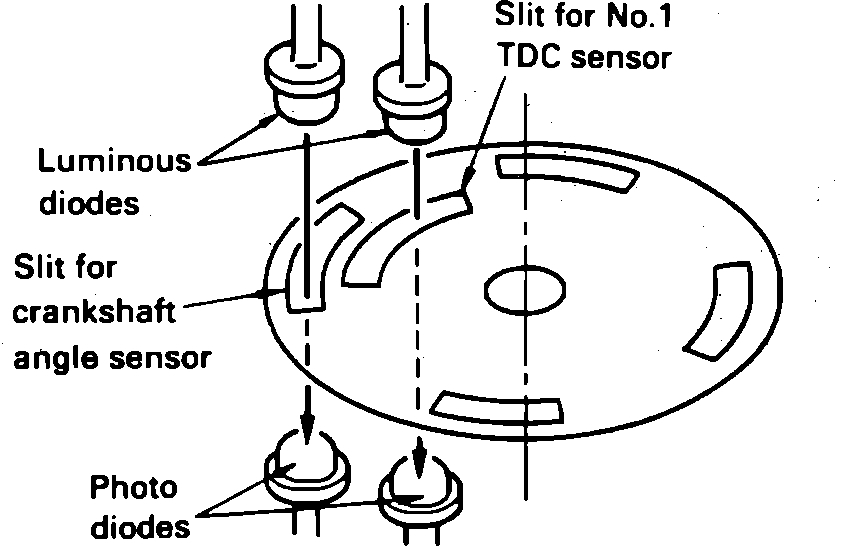 The disc contains 4 large slits around its circumference to indicate the crankshaft angle. An additional light-transmission slit located inward from the edge is used to indicate number one cylinder's top dead center position. The pick-up unit assembly uses two luminous diodes and two photo diodes, in order to detect the two different slits. There is a very slight clearance between the luminous diodes and the photo diodes, and the disc rotates within this space.