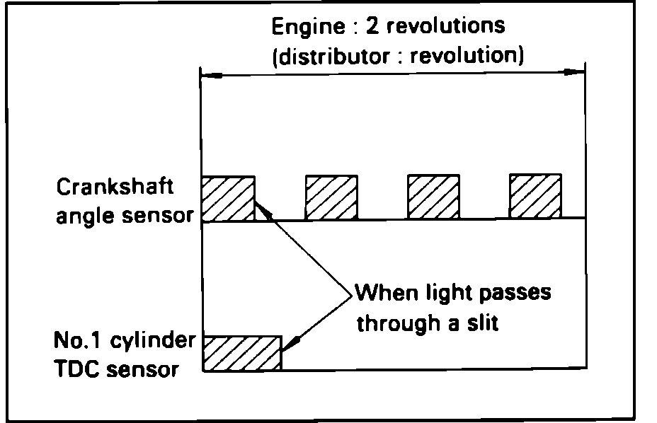 Top dead center is detected by the signal obtained through the one inner slit of the disc. The MPI controller, based upon this signal, determines which of the four pulses from crank angle sensor is the signal for the #1 cylinder.