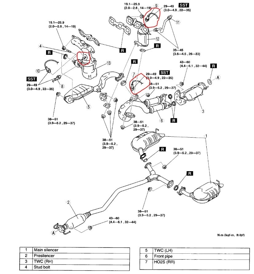 That car has a total of four converters under it. Two are parts of the exhaust manifolds, the third is attached under the engine while the fourth is back under the car under the passenger side. They are items 3, 5, 12, 13 in the second image. Both of the front converter units have O2 sensors in them (9 and 10), the downstream sensors are 7 and 8.