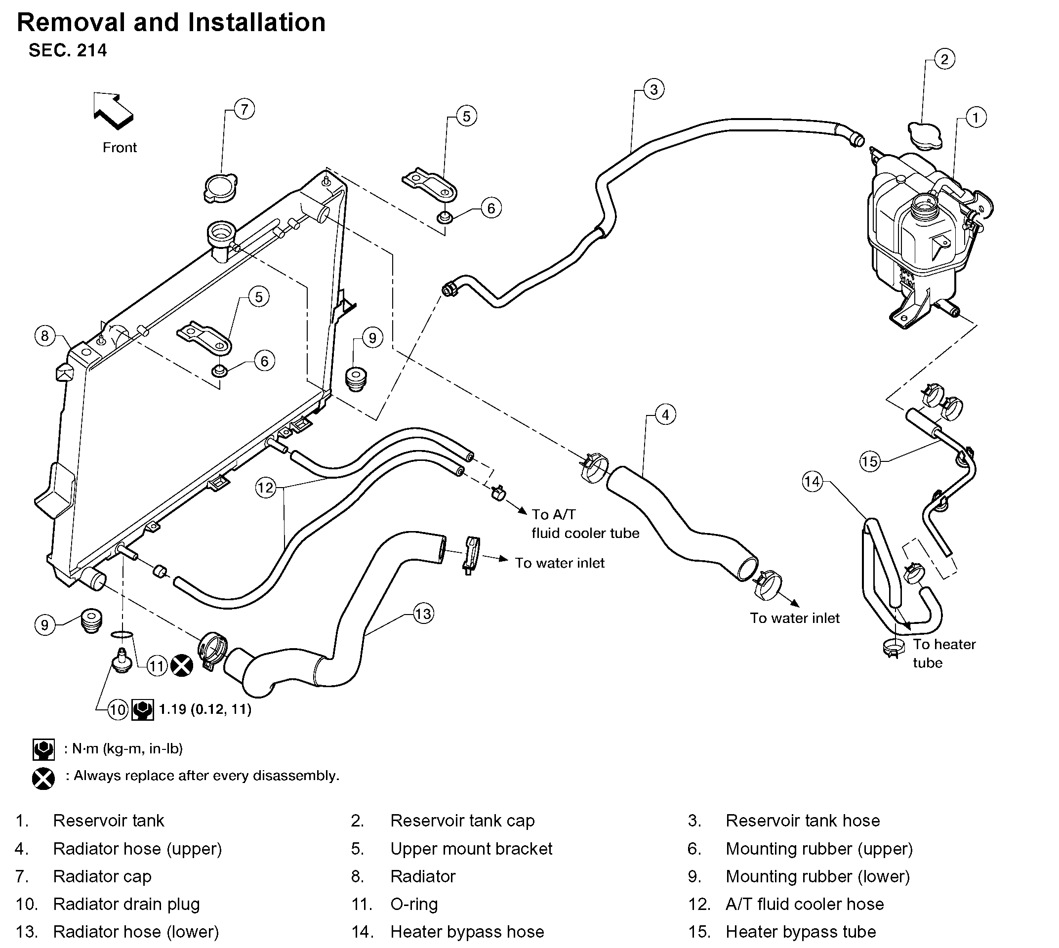 5. Removal radiator hoses (upper and lower) and reservoir tank hose.