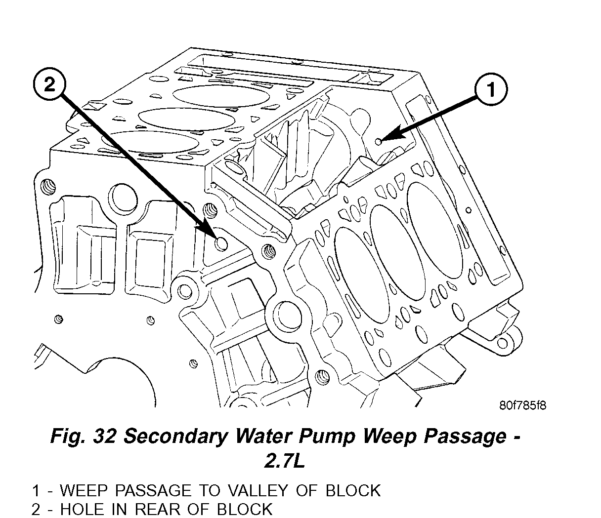 3. Coolant leaks: If the pump primary weep passage is plugged, coolant may come from the secondary weep passage and collect in the valley of the engine. The coolant will eventually run out the back side of the engine (Fig. 30) and (Fig. 32). Leakage from the secondary weep passage may give false indications that core plug(s) may be leaking on the back side of the engine block. If this condition is found, clean the primary weep passage of debris.