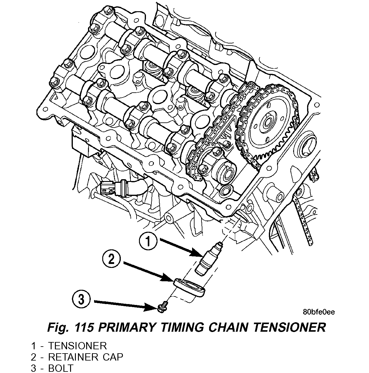 7. Remove primary timing chain tensioner retainer cap and tensioner from right cylinder head (Fig. 115).