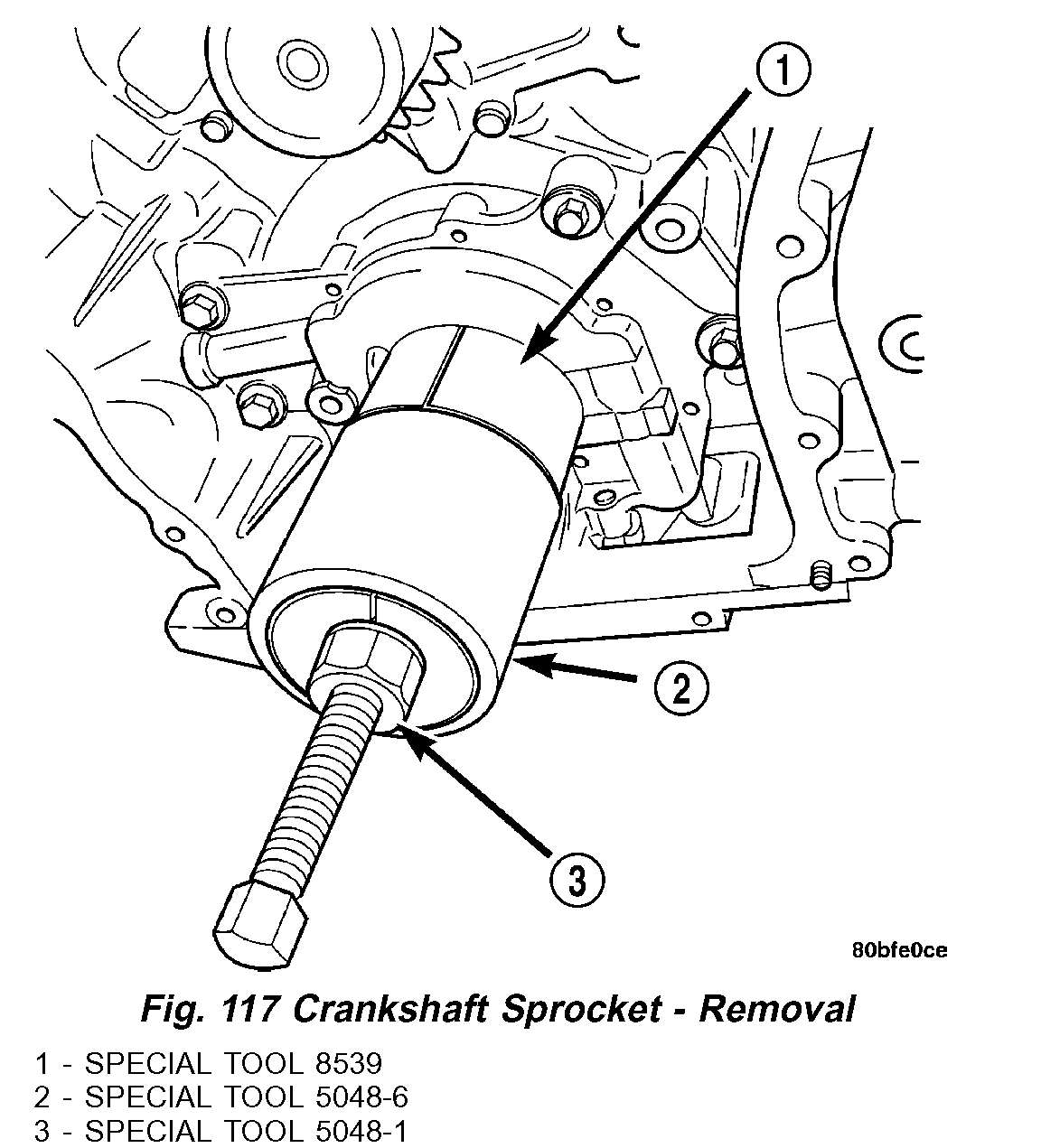 2. Remove crankshaft sprocket by first installing the crankshaft damper bolt. Apply grease or equivalent to damper bolt head and position Special Tools 5048-1, 5048-6, and 8539 on sprocket and crankshaft nose (Fig. 117). Remove sprocket using care not to rotate the crankshaft.