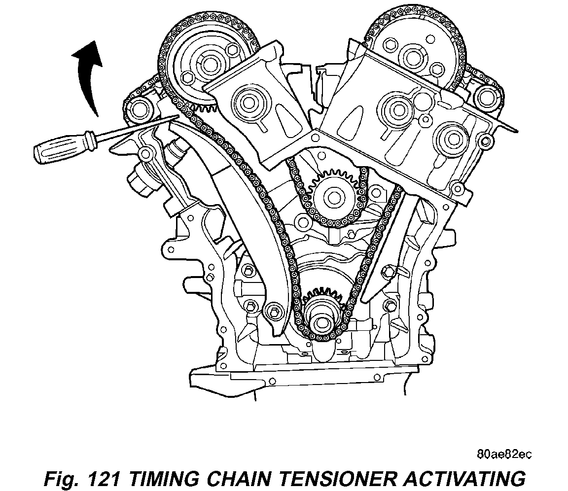 21. Activate the timing chain tensioner by using a flat bladed pry tool to gently pry tensioner arm towards the tensioner slightly (Fig. 121). Then release the tensioner arm. Verify the tensioner is activated (extends).
