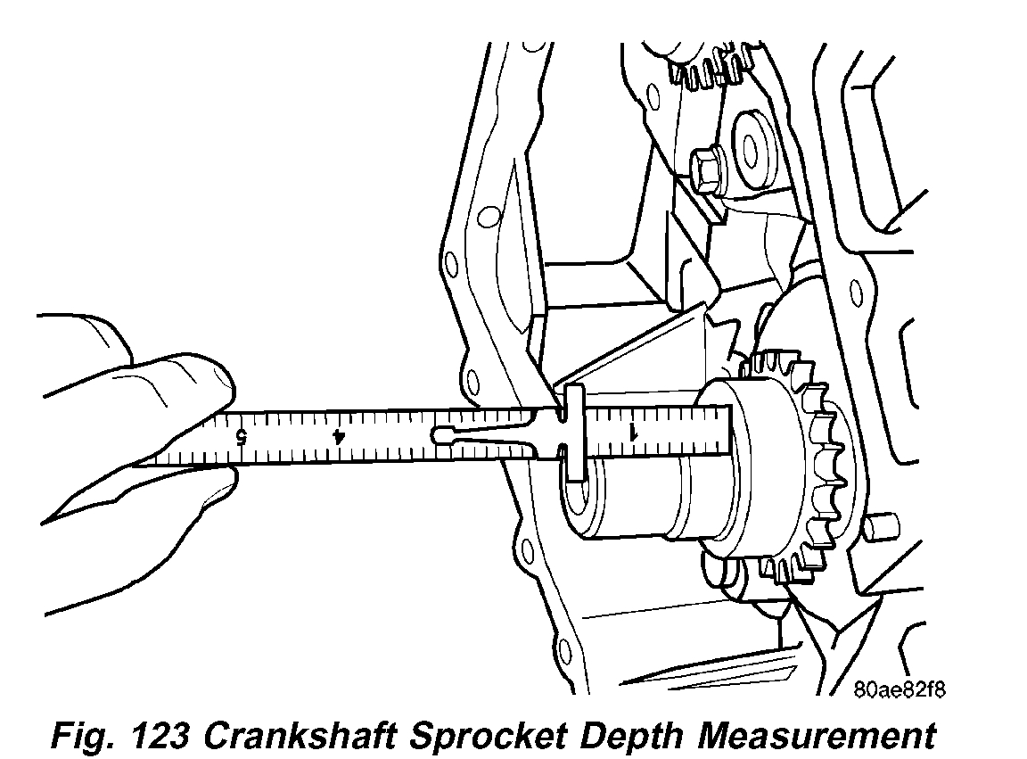 2. Verify that crankshaft sprocket is installed to proper depth by measuring from sprocket outer face to end of crankshaft (Fig. 123). Measurement should read: 39.05 ± 0.50 mm (1.5374 ± 0.020 inch).