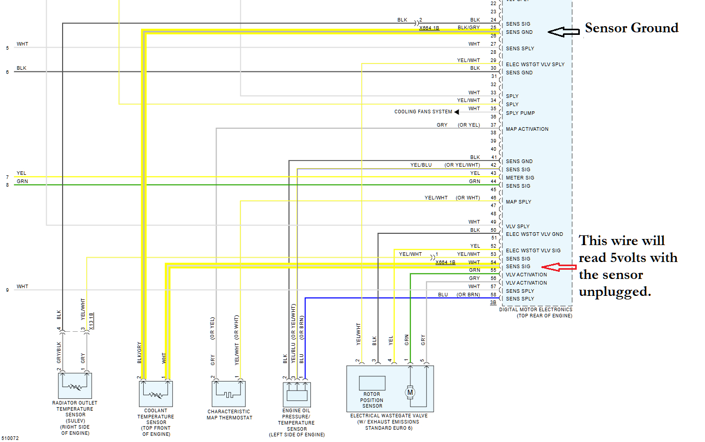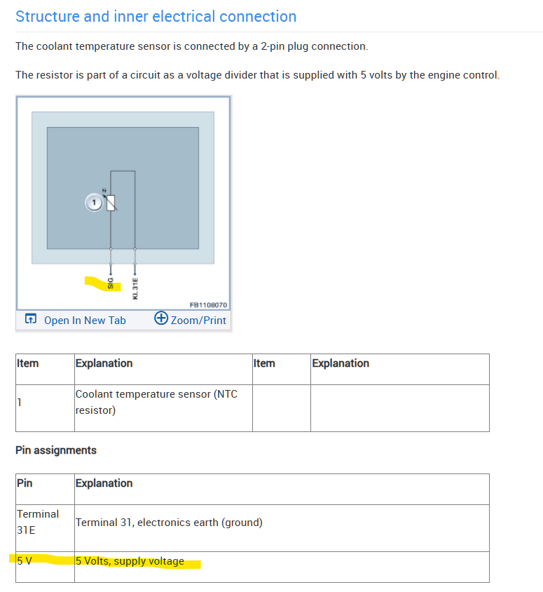 Hello, the coolant temp sensor uses two wires, one of which the DME sends out a 5v reference and the other wire is a ground through the DME. The coolant temp sensor then pulls that 5volts down according to the resistance it has as the temp changes. So with a signal high code, the sensor is either missing its ground or the sensor is open circuit internally. So unplug the sensor and one wire should read 5volts and the other should be the ground wire. You can first check the sensor for resistance, if it reads OL, (out of limits) then its and open internally, if it reads some resistance, next check for continuity on the ground wire to the DME to make sure its not an open circuit. You can also check your live scan tool data, and when a temp sensor is open circuit in some way they will usually read -40f degrees. I'm going by the service info for a 2016 BMW 328i Sedan (F30)