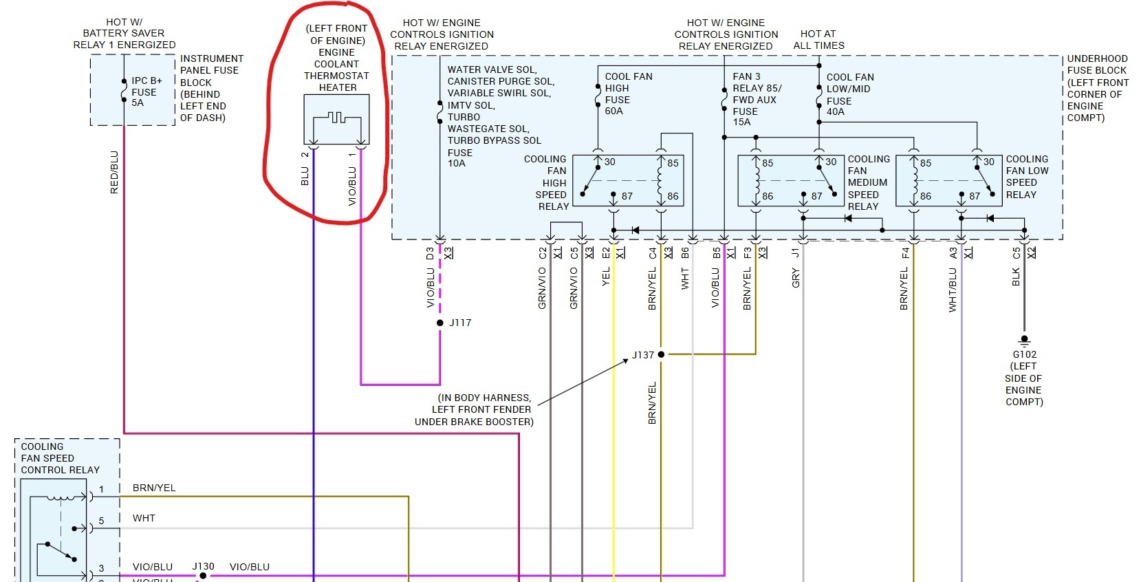 P0599 is for a thermostat heater control circuit high voltage. The circuit is fed voltage in on the Violet w blue wire, the PCM turns the heater on and off using PWM voltage on the blue wire. The heater controls the thermostat through the connector on it. You can test the circuit using a meter to measure the resistance between the two terminals on the thermostat. It should be between 13-15 ohms for a good heater. If that test is okay, then the next step is to use a test light and touch the connector for the Violet wire on pin one. If you have voltage there and the heater tests good then the next check is to see if there is an issue in the heater control side, that is the blue wire on pin two. The easy way to test that part of the circuit you need a scan tool.