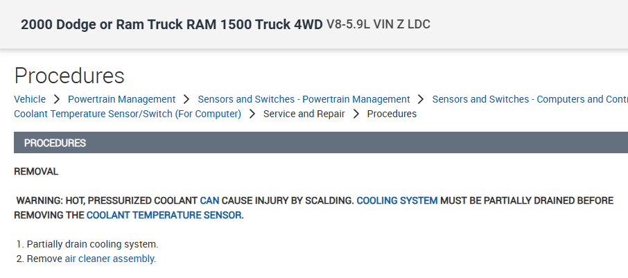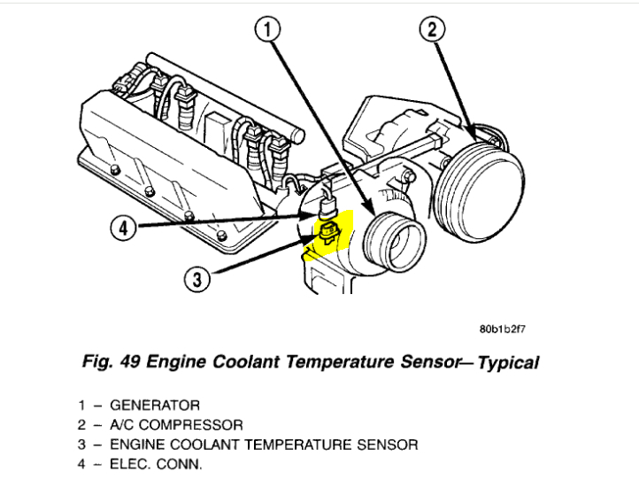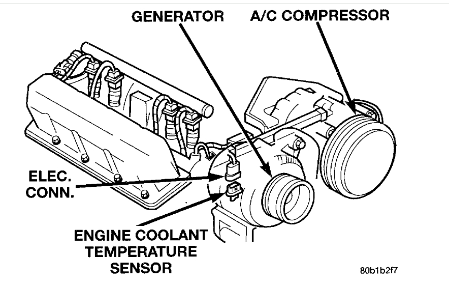A 6.0L wasn't offered, Chances are you are referring to a 5.9L 360CI engine. If I am correct, the engine coolant temperature (ECT) sensor is installed into a water jacket at the front of the intake manifold located near the rear of the alternator. See pic 1 below