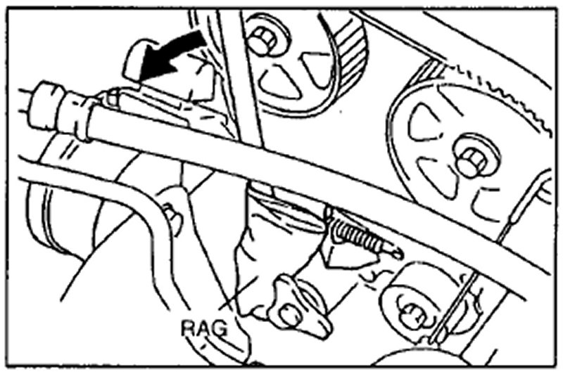 8. Loosen the tensioner lock bolt to apply tensioner to the timing belt.