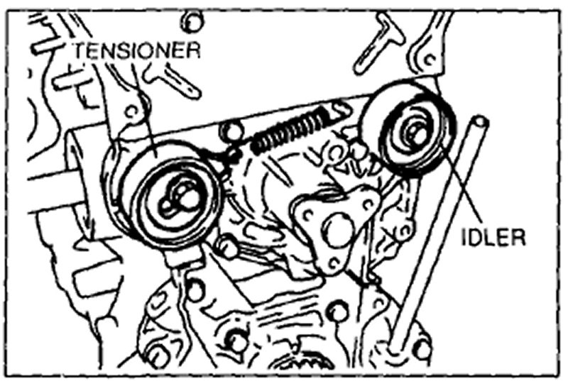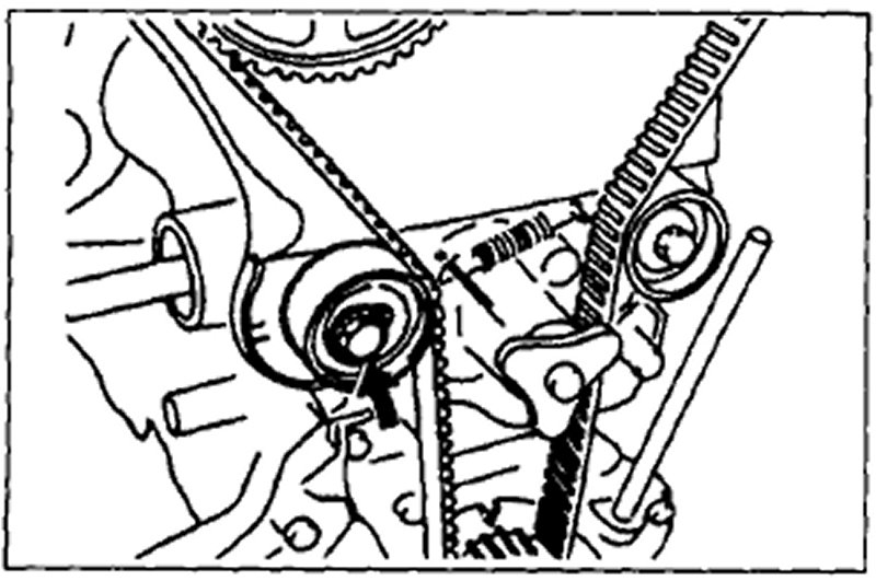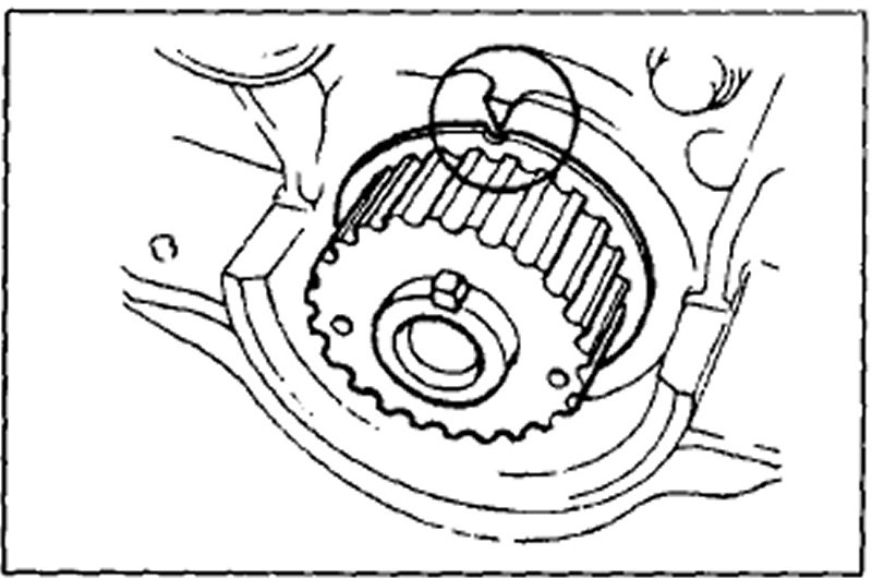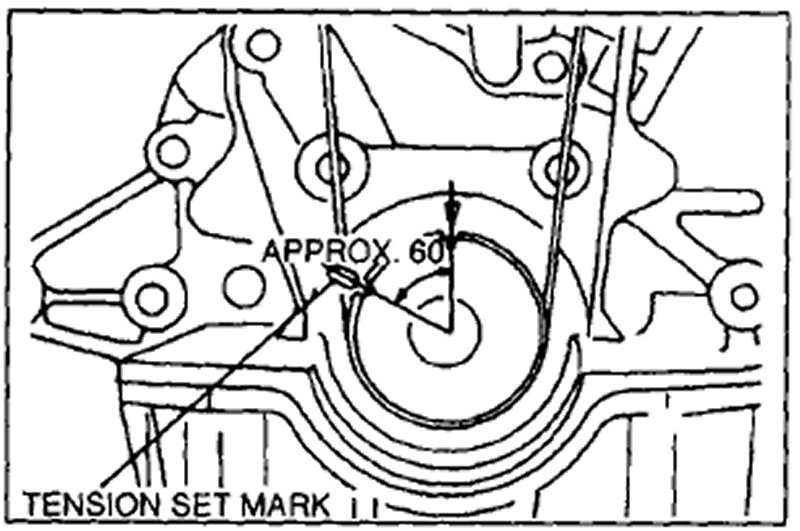 7. Turn the camshaft 1 and 5/6 turns and align the timing belt pulley mark with the tension set mark for proper timing belt tension adjustment.
