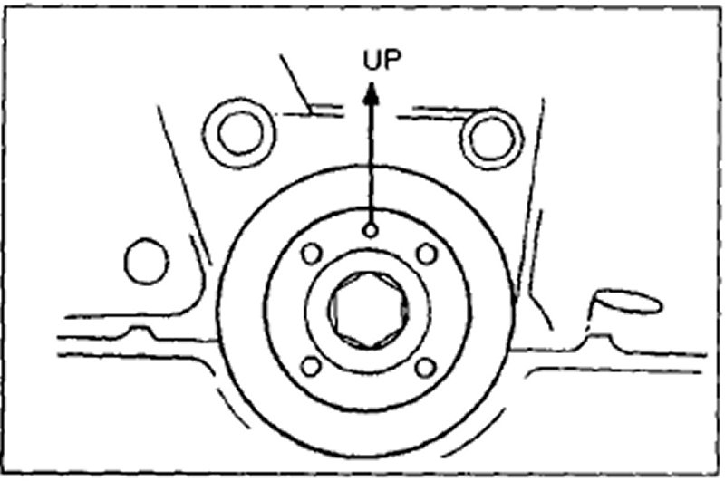 5. Turn the crankshaft two turns clockwise and face the pin on the pulley boss upright. Do not turn the crankshaft counterclockwise.