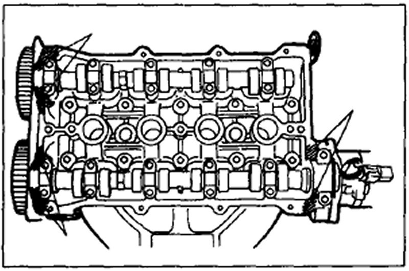 11. Measure the timing belt deflection by applying moderate pressure 98 N [1 0 kgf, 22 Ibf] midway between the camshaft pulleys. If the deflection is not correct, repeat from step 8 above.