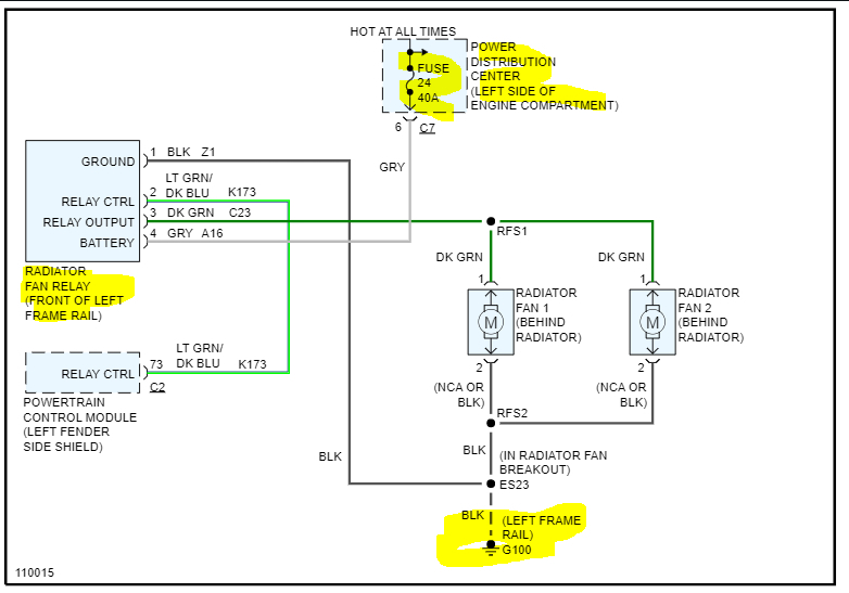 Also, I attached the wiring schematic below for the radiator fan circuit. There is a fuse that will need to be checked as well as a fan relay. I highlighted both in the pic. I also highlighted the ground because it is a common ground for both fans. Make sure it is in good condition and not corroded or damaged.