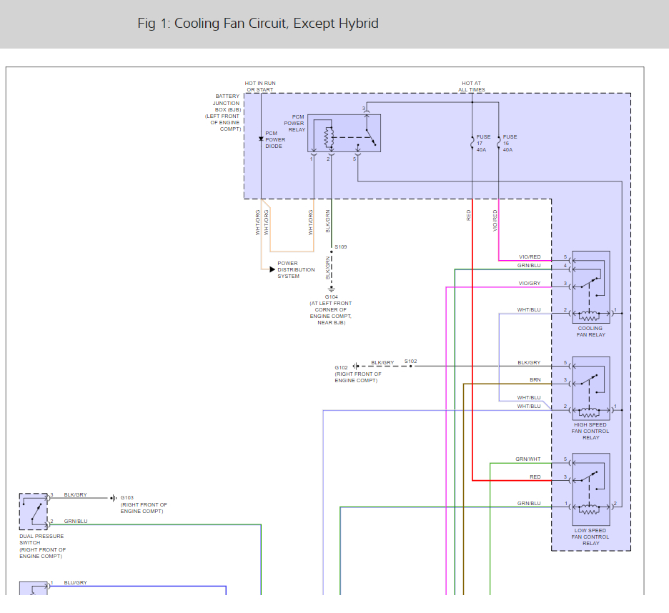 Yesterday I checked for power at the driver fan plug and had my 12 volts ref (key on engine on engine warm but not blazing hot) and then disconnected the three fan relays one by one and would lose the voltage when the high and low speed relays were removed. Not the main unit relay. (Odd?)