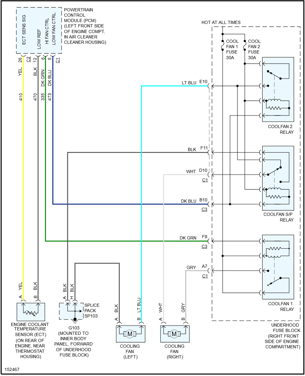 Car sat for two years. Put in new battery got car running. Started to overheat because cooling fans will not turn on. It was eighty degrees outside. A friend pulled out some relays and may have plugged them in upside down. Where do I start? Are there fuses also?
