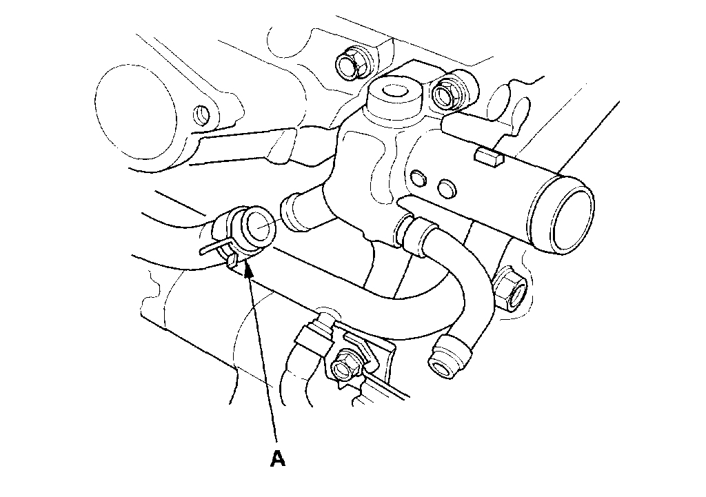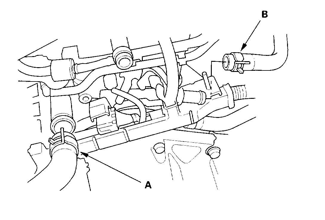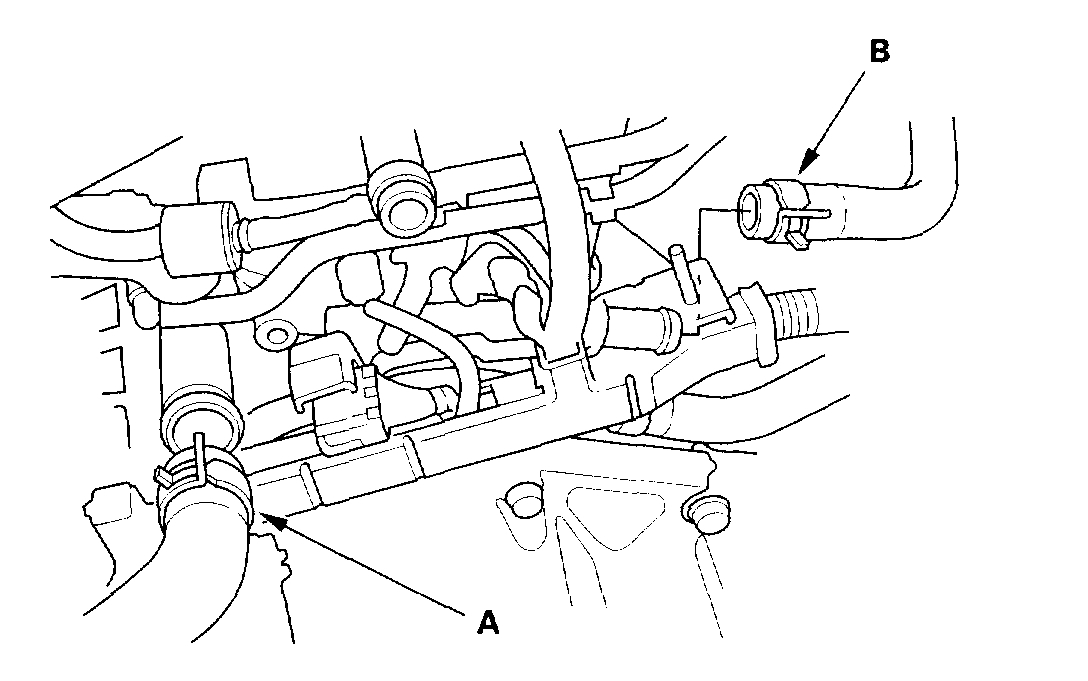 10. Remove the upper radiator hose (A) and heater hose (B)