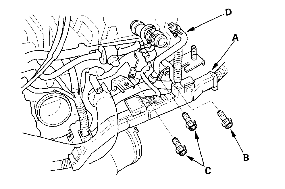 11. Remove the harness holder (A) from the bracket, then remove the connecting pipe mounting bolt (B) and brake booster vacuum line mounting bolts (C).