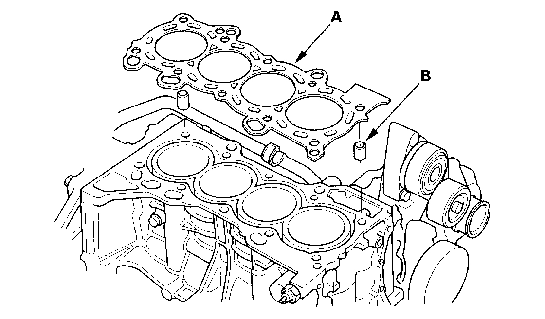 2. Install the new cylinder head gasket (A) and dowel pins (B) on the cylinder block. Always use a new cylinder head gasket.