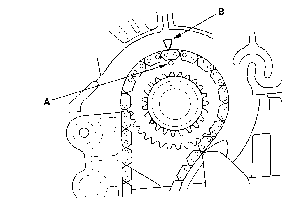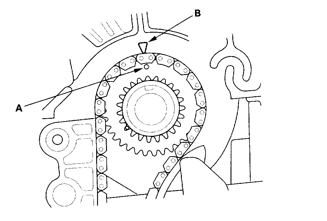1. Set the crankshaft to Top Dead Center (TDC). Align the TDC mark (A) on the crankshaft sprocket with the pointer (B) on the cylinder block.