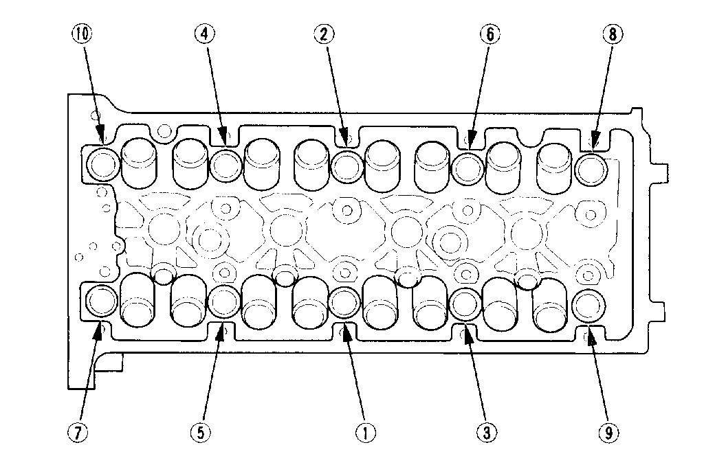 8. Tighten the cylinder head bolts in sequence to 39 Nm (4.0 kgf-m, 29 ft. lbs.). Use a beam-type torque wrench. When using a preset-type torque wrench, be sure to tighten slowly and do not overtighten. If a bolt makes any noise while you are torquing it, loosen the bolt and retighten it from the first step.