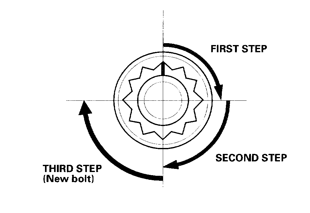 9. After torquing, tighten all cylinder head bolts in two steps (90° per step). If you are using a new cylinder head bolt, tighten the bolt an extra 90°.