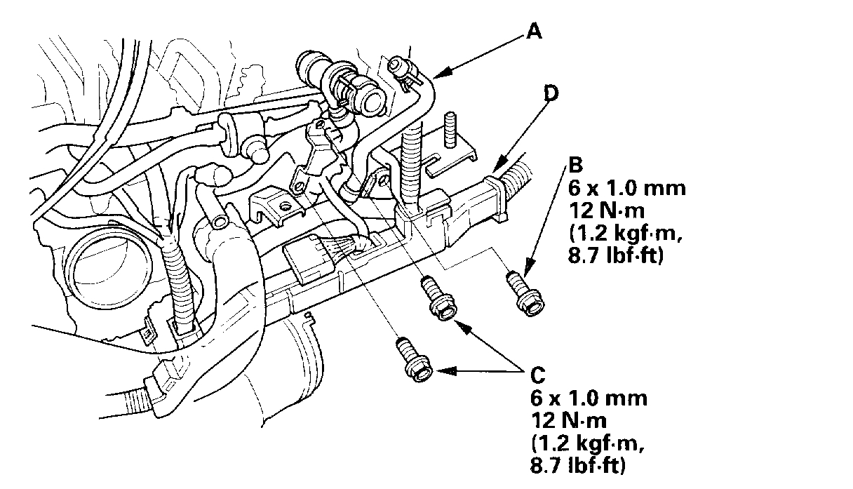 12. Tighten the connecting pipe mounting bolt (B) and brake booster vacuum line mounting bolts (C), then install the harness holder (D) on the bracket.