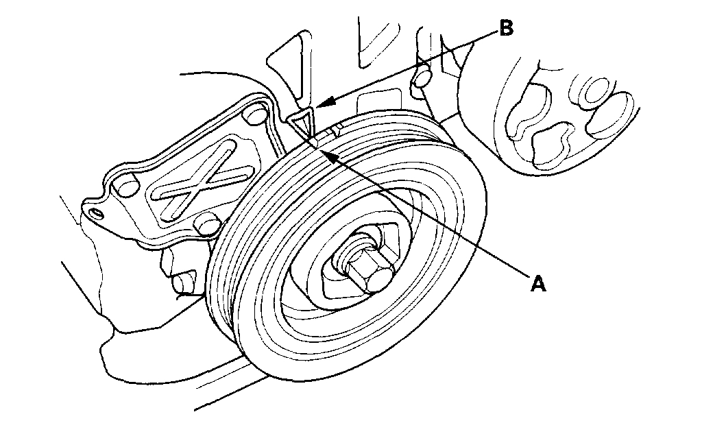 1. Turn the crankshaft pulley so its Top Dead Center (TDC) mark (A) lines up with the pointer (B).