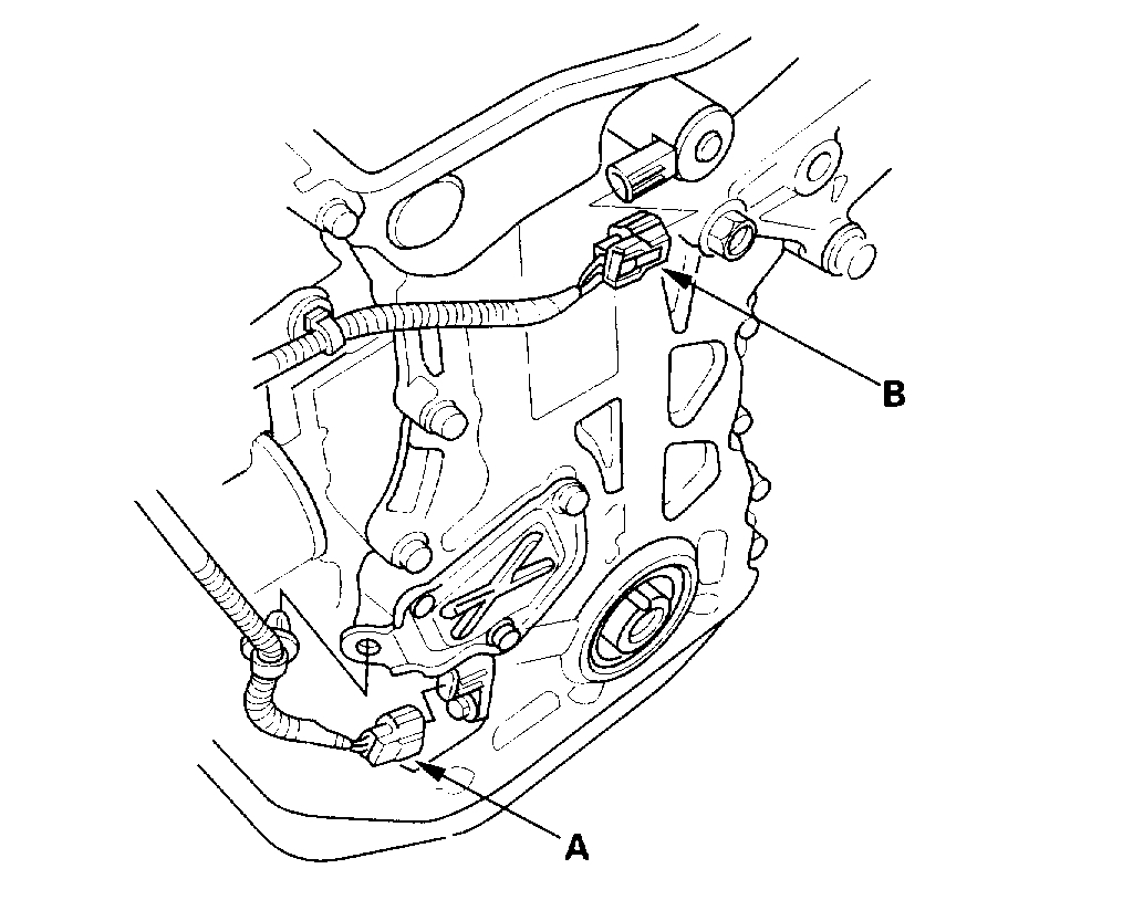 7. Disconnect the Crankshaft Position (CKP) sensor connector (A) and Variable Valve Timing Control (VTC) oil control solenoid valve connector (B).