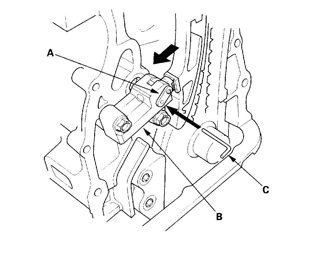 15. Align the holes on the lock (A) and the auto tensioner (B), then insert a 1.5 mm (0.06 inch) diameter pin (C) into the holes. Turn the crankshaft clockwise to secure the pin.