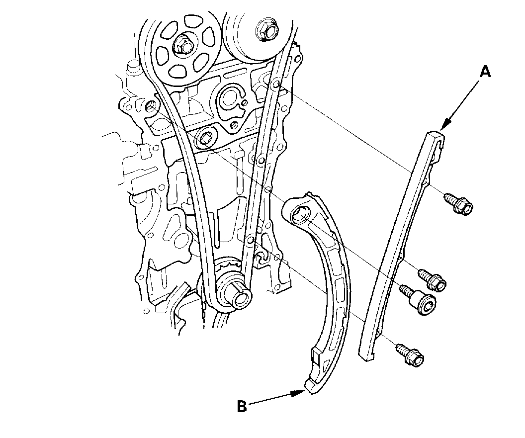 18. Remove the cam chain guide A (A) and tensioner arm (B).
