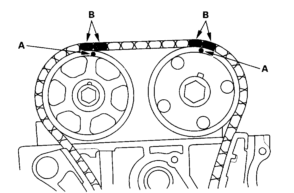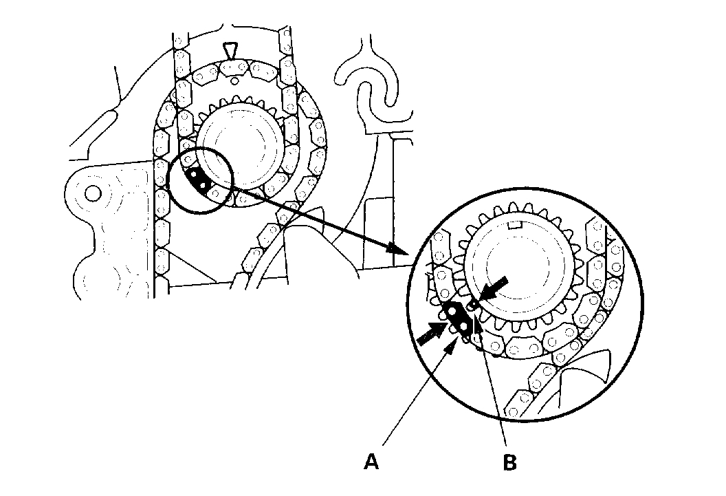 3. Install the cam chain on the crankshaft sprocket with the colored piece (A) aligned with the punch mark (B) on the crankshaft sprocket.