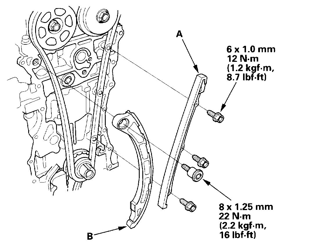 5. Install the cam chain guide A (A) and tensioner arm (B).