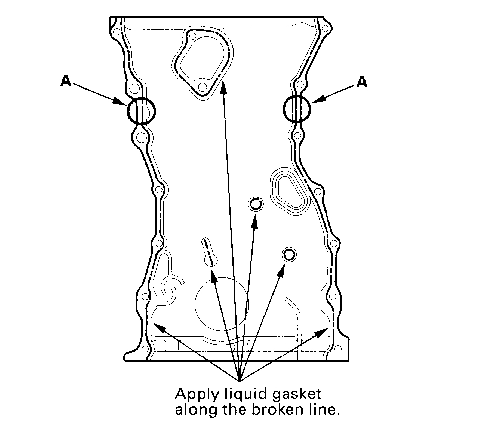 13. Apply liquid gasket to the cylinder block upper surface contact areas (A) on the chain case.
