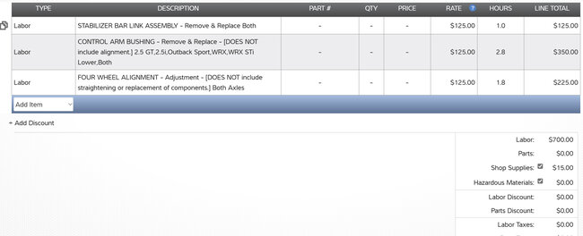 Cost estimate for Sway Bar Bushings - Rear Links and Bushings, Control Arm Bushings, and Subaru - Four-Wheel Alignment?