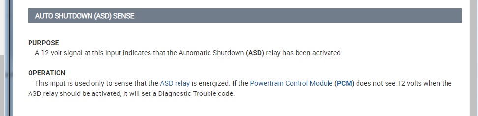 Specifically, the Engine Computer must see signal pulses from the crankshaft position sensor and the camshaft position sensor to know the engine is rotating, (cranking or running). If either signal is missing, the ASD relay does not get turned back on during cranking, and you'll find 0 volts at the ignition coil at that time. Many people see the 12 volts at the coil for that first one second, and conclude incorrectly it's there all the time The easiest way to tell if the ASD relay circuit is working is to listen for the hum of the fuel pump for that one second when the ignition switch is turned on.
