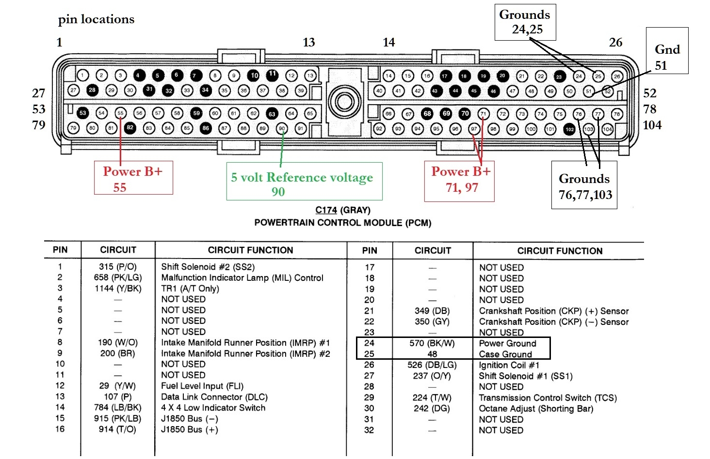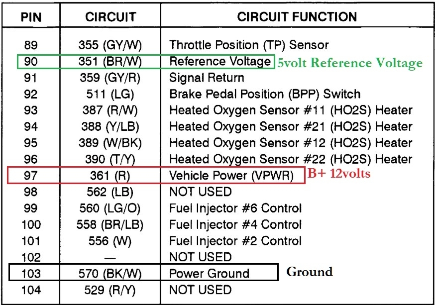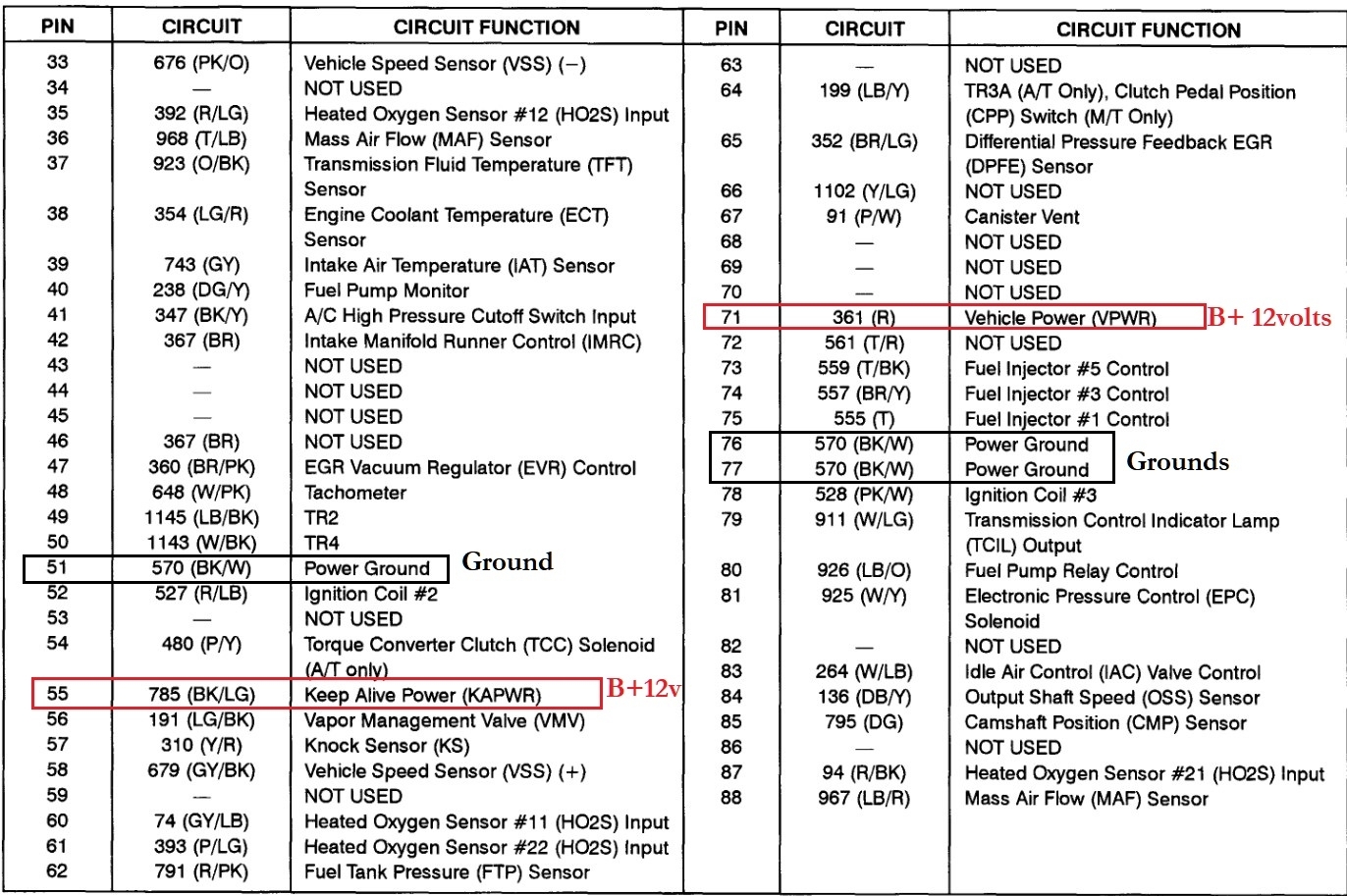 Diagrams 3,4,5 are for the PCM Connector so you can check for power and ground right at the connector, hope fully it's not too confusing, you just need to concentrate on the 6 Grounds and the 3 Power feeds to the PCM. D