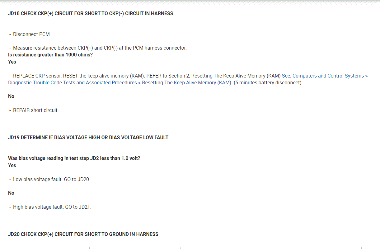 After doing the CKP flowchart diagnostic you attached. I moved on to test the MAF. While trying to probe the pins in the round connector near the coolant reservoir, I inadvertently touched one of the other pins in there. Immediately the PCM relay AND the IAC valve began to chatter incessantly. I had to turn key off to stop chatter. Turning KOEO again, relay was quiet but IAC still chattering. Turned key off again for 3-4 minutes and then back to KOEO and no more chatter from IAC.
