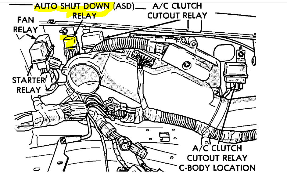 Is it the automatic shutdown relay (ASD) you are referring to? Let me know. I'm trying to look through wiring schematics, but they are extremely limited because of the model year. However, based on your description, it sounds like the ASD relay is faulty or the ECM isn't providing a ground path to actuate the relay.