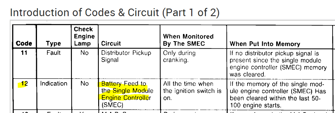 Okay, the two are tied together. Code 12 is related to the single module engine controller (SMEC) and the 42 is related to the automatic shutdown (ASD). (see pics 1 and 2 below).