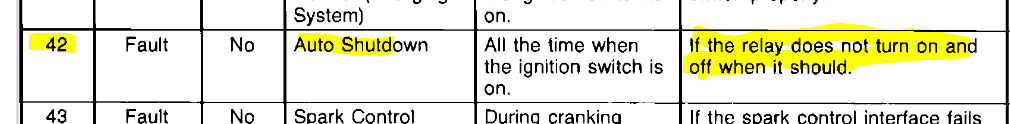 Code 42 - Auto Shutdown Relay Control Circuit: This code indicates a problem in the auto shutdown (ASD) relay circuit.