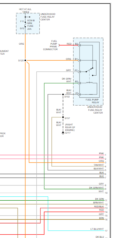 Engine cranks. No spark. No fuel pressure. I pulled the fuel pump relay and jumped 87 to 30 and fuel pump runs, builds pressure to 60 PSI. When the key is on, there is no power to the timed test circuit. Also, when the ECM-B fuse is in, there is a parasitic draw of 0.8 AMPS. When the fuse is pulled then amp draw goes down to 0.01 AMPS.