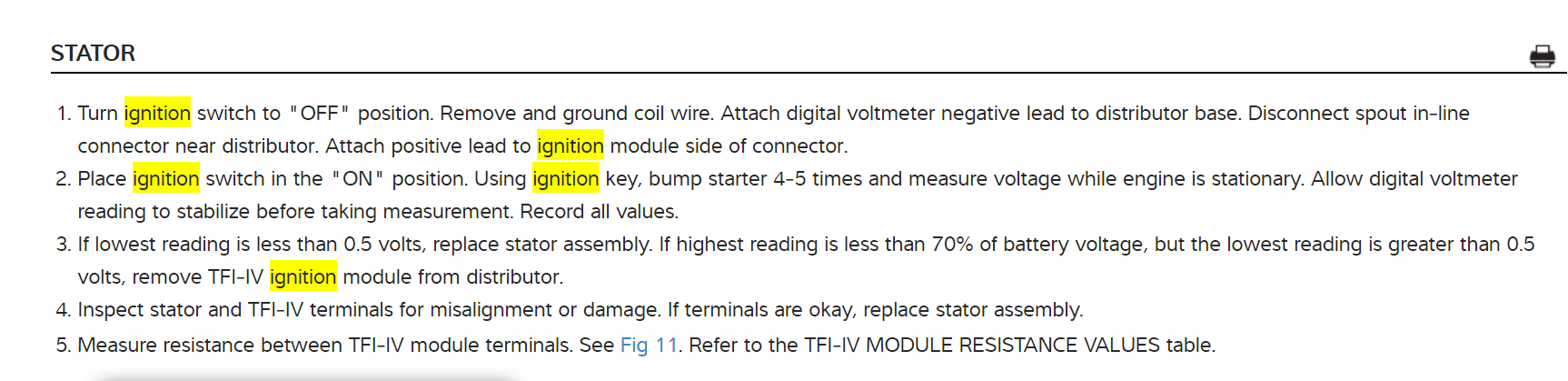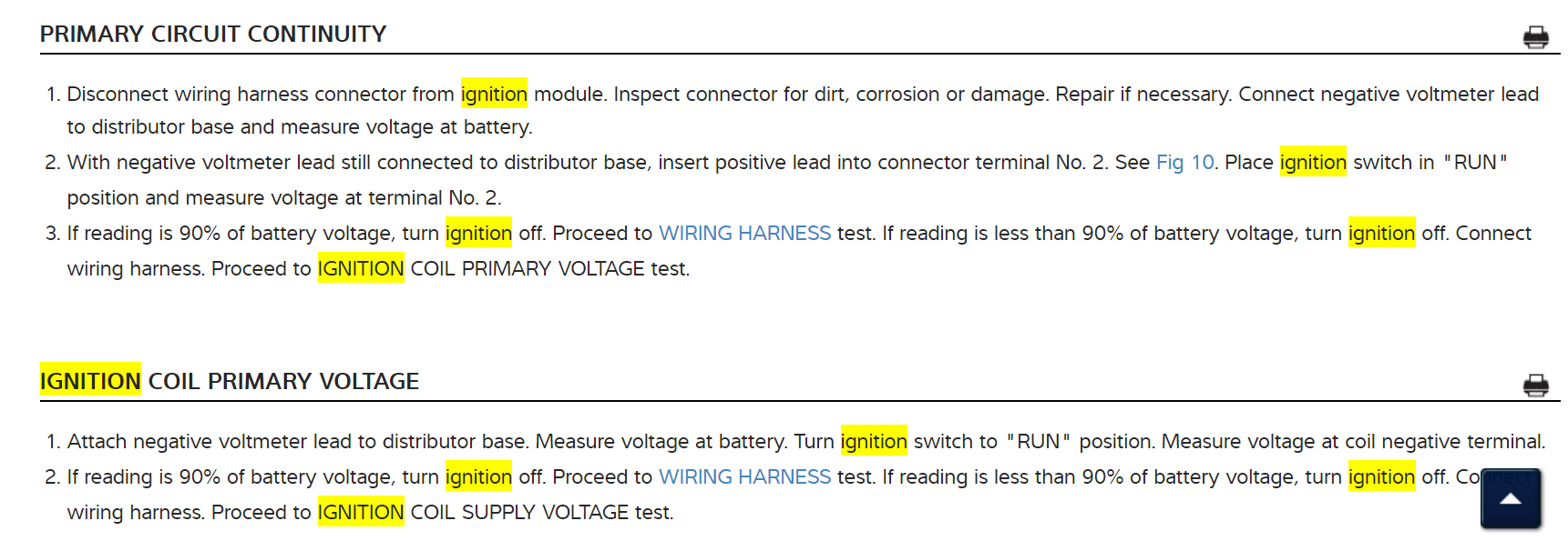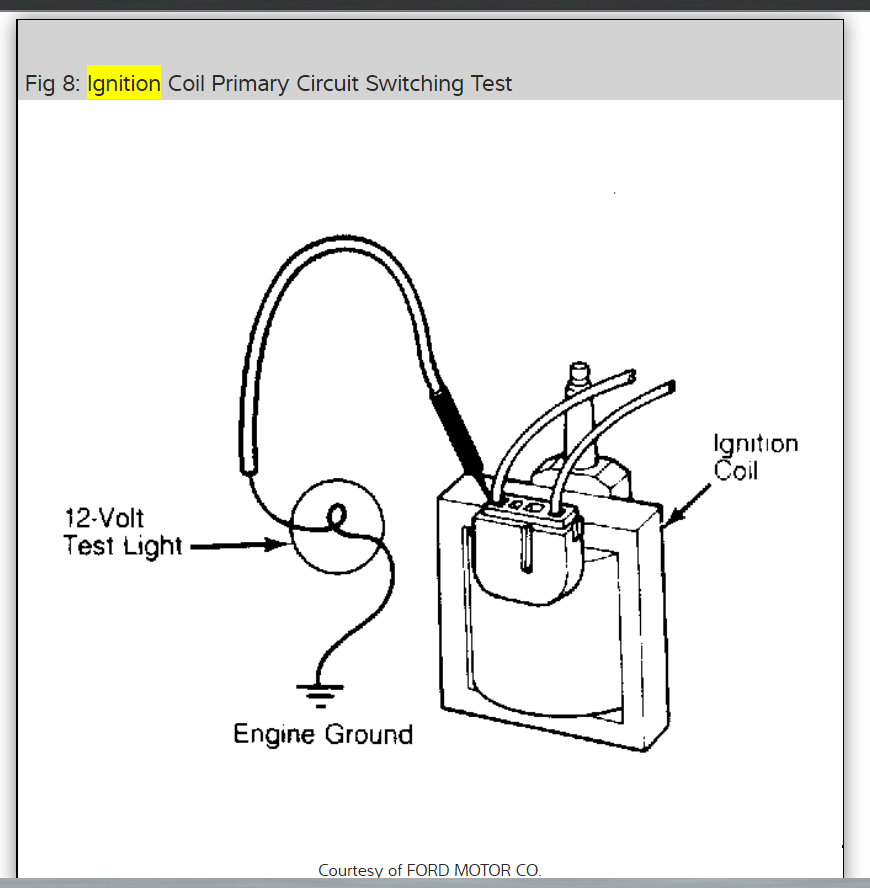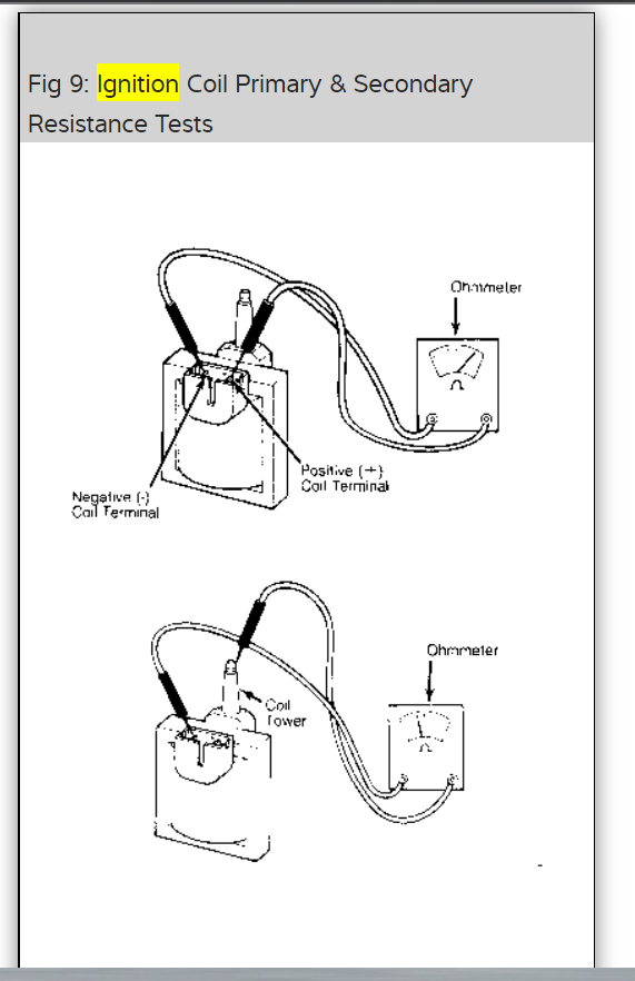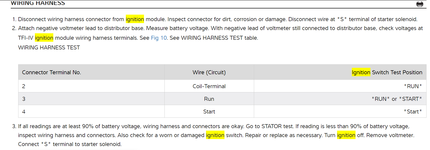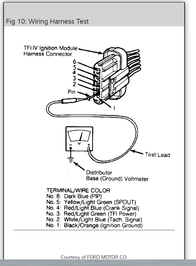 Okay, fig. 10 was wanting you to check for voltage at pins 2,3,and 4 of the ignition control module connector. Have the negative probe(Black) connected to the base of the distributor. Unhook the "S" wire from the starter solenoid. If the voltage at each pin is 11 volts - 12.6 volts then go to next text. If the voltage at any one of the three pins, 2,3,or 4 is less than 11 volts then check for worn connector or wiring. Repair as necessary. Do this test for me and get back to us with what you find out please.